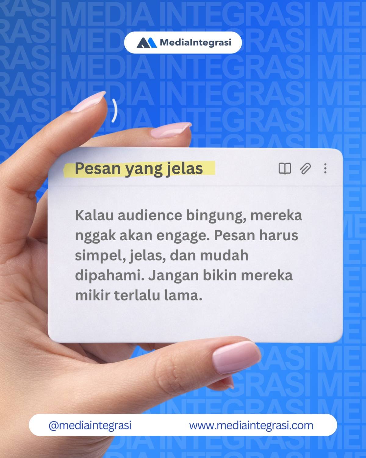 Kalau audience harus mikir terlalu lama, mereka akan skip. Pesan yang jelas bikin orang langsung paham dan lebih mudah engage. Fokus ke komunikasi yang ringkas tapi impactful.
